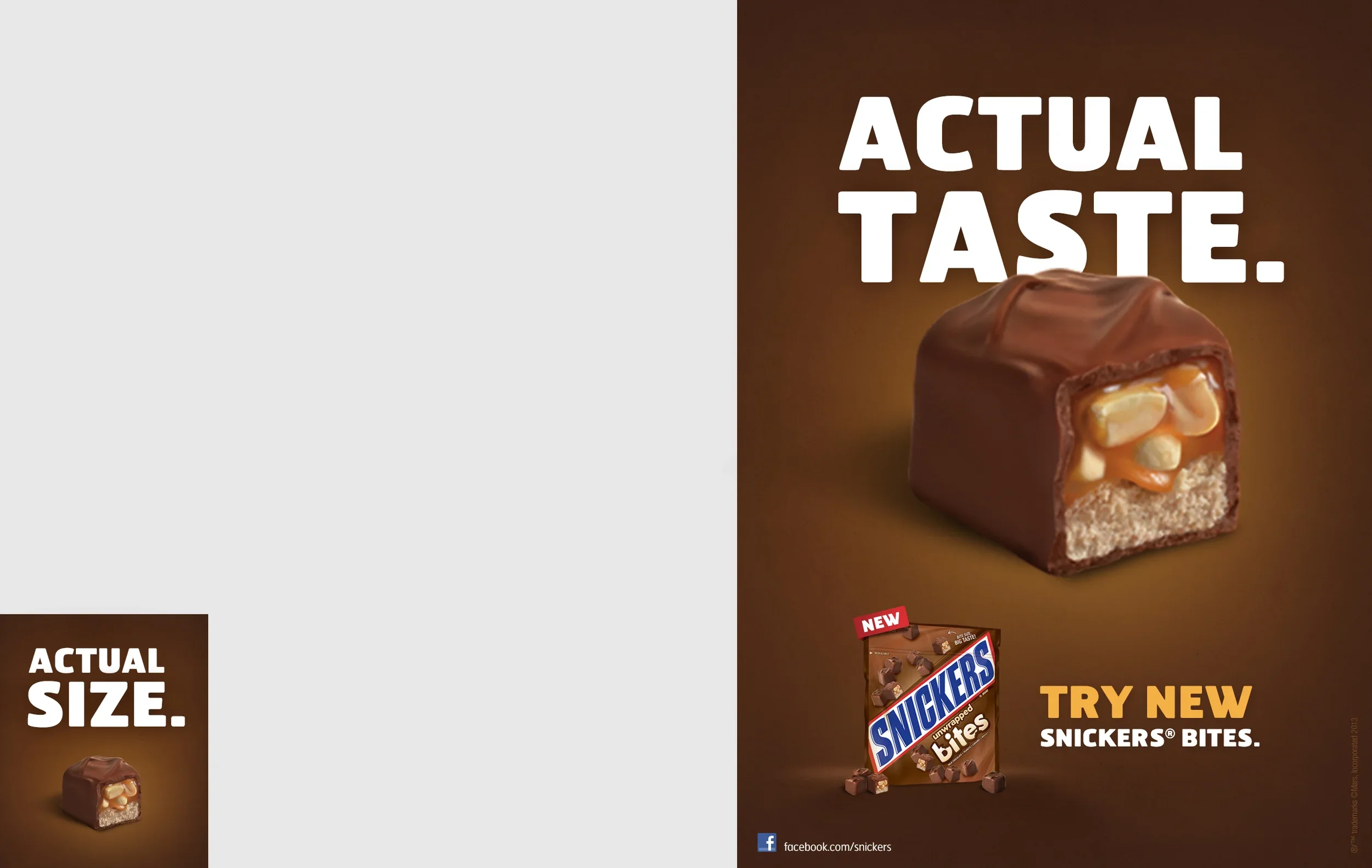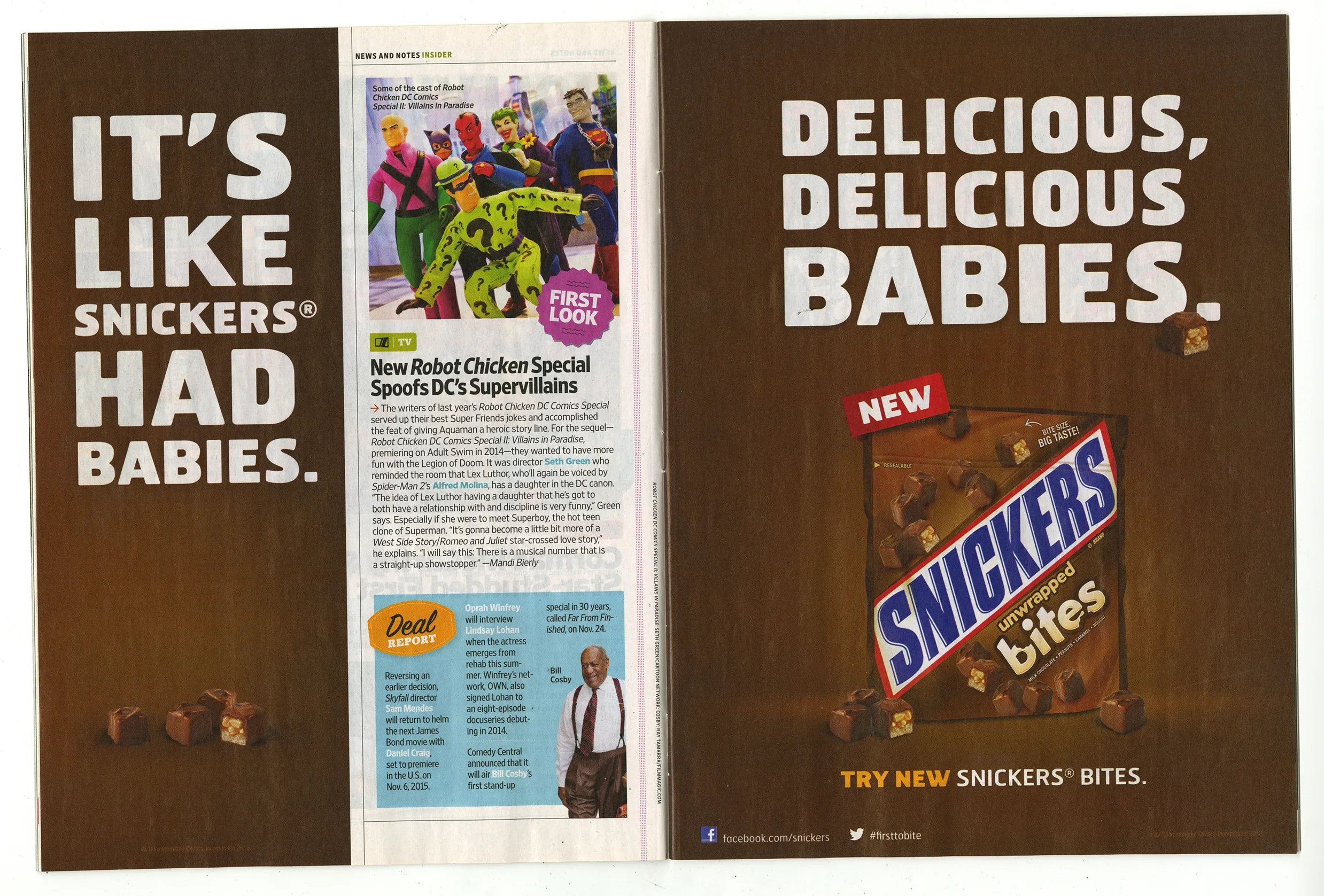 A series of playful, multi-page newspaper and magazine ads introducing Snickers Bites.
