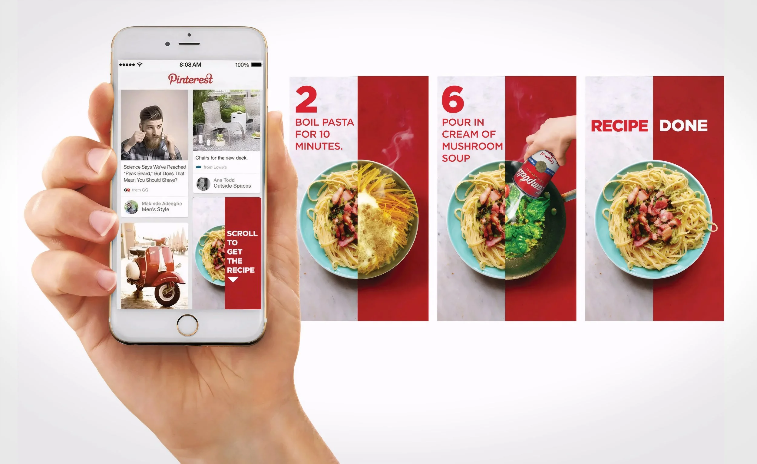 We repurposed Pinterest’s Scrolling Cinematic Pins from a storytelling format into a practical cooking interface. As users scroll, each action unfolds beside a static view of the finished dish—transforming a familiar ad unit into a usable recipe tool built for the platform.
