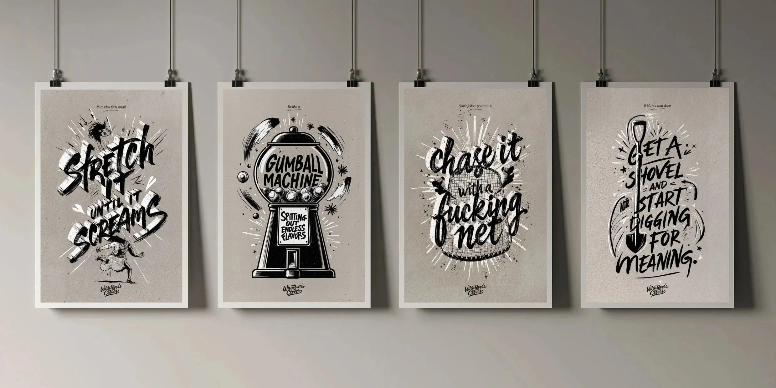 A series of playful motivational posters designed and sent to industry friends during those inevitable low-motivation moments—simple reminders to keep ideas flowing.